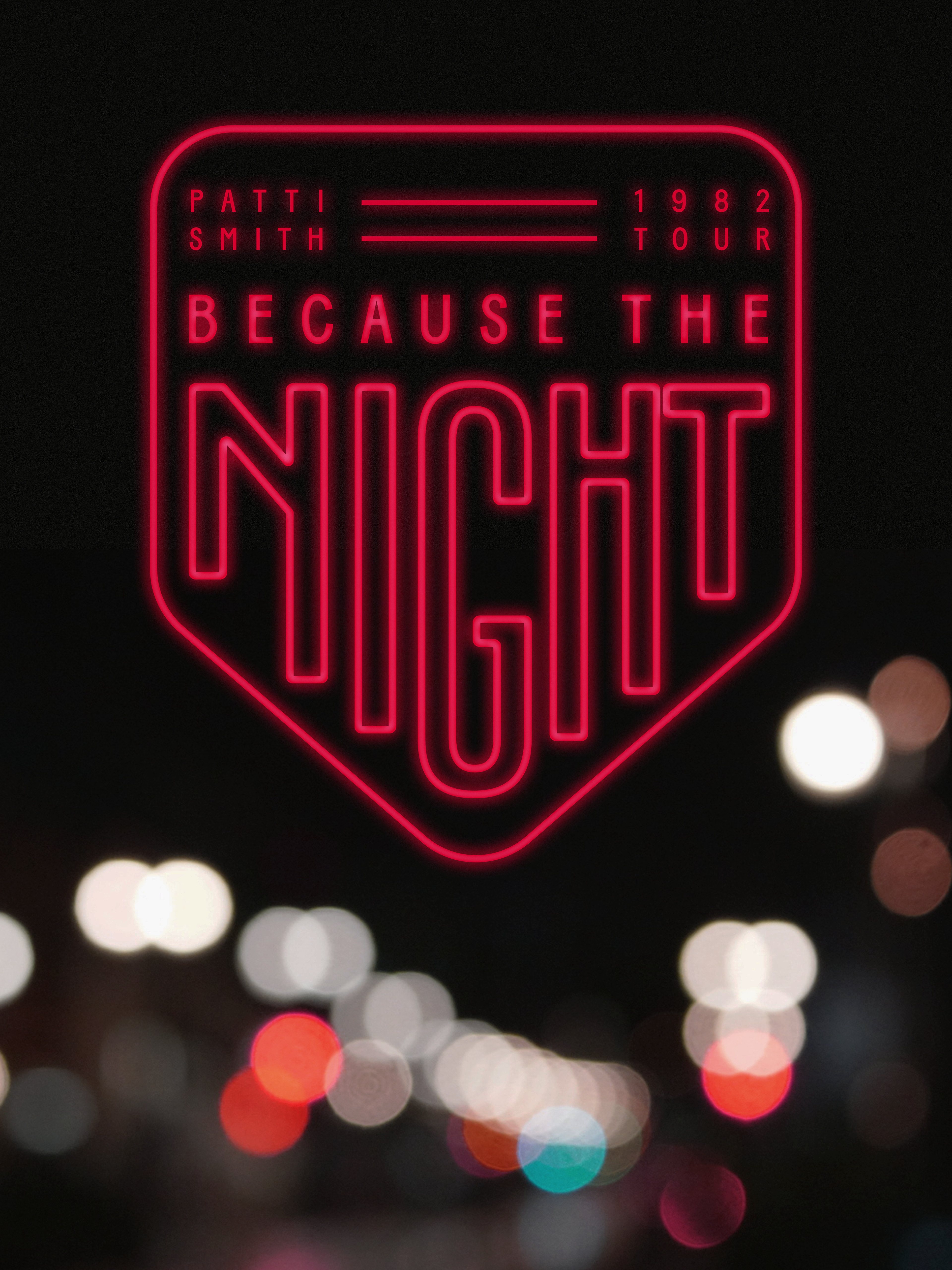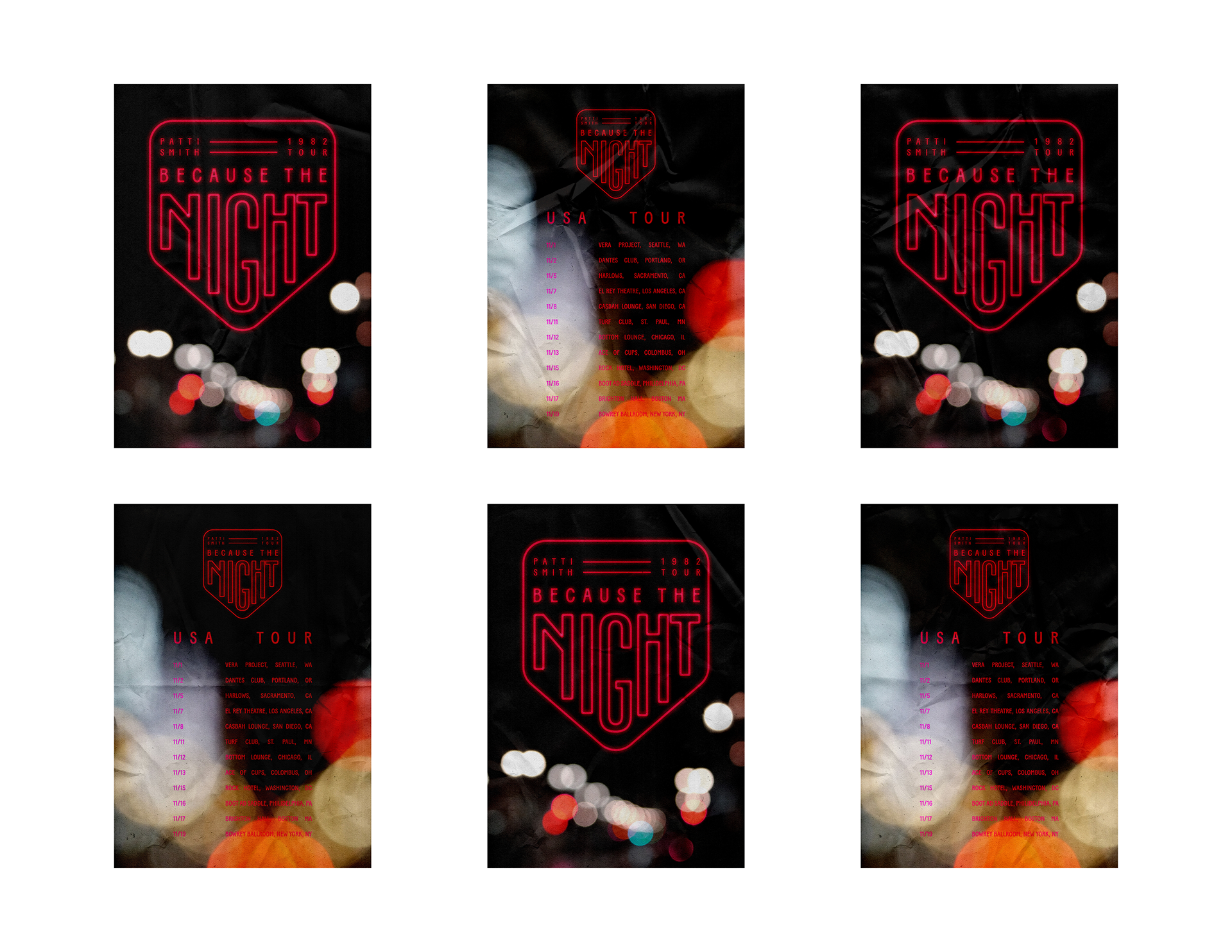 This poster project is inspired by Patti Smith's song, Because the Night. Neon and city lighting are used to reference the grungy 80's New York bar scene to promote a hypothetical tour.